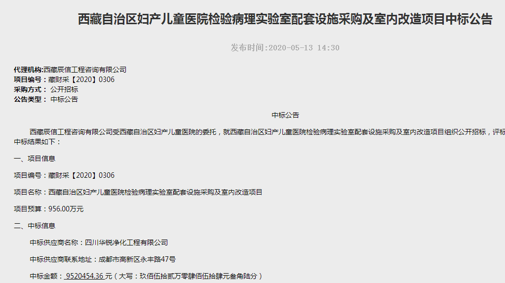 西藏辰信工程咨询有限公司受西藏自治区妇产儿童医院的委托,就西藏自治区妇产儿童医院检验病理实验室配套设施采购及室内改造项目组织公开招标,评标工作已经结束,中标结果如下: