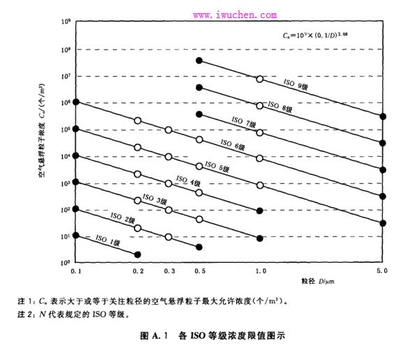 图 A. l 是表 1空气洁净度等级的图示 ,仅起说明作用 。表 1的 ISO 等级在图中以直线表示 ,直线代表关注粒径阈值所对应的等级浓度限值 。这些限值是根据 3. 2 中的式(1) 计算得来 。而图中的直线 只是等级限值的一种近似表示 ,不能以此确定限值,确定限值仍使用式 ) 。